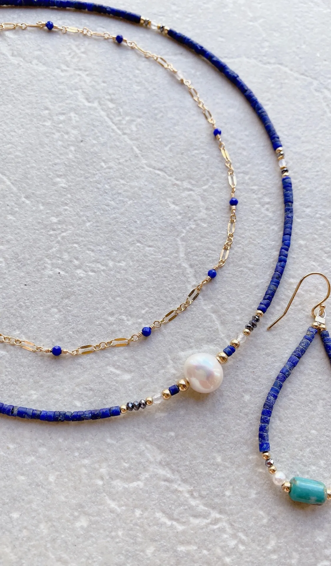 今回のネックレスは、ラピスラズリを贅沢に使い、中央には柔らかな光を放つ パール をあしらったチョーカーネックレス。