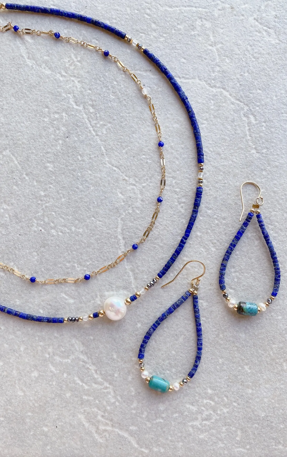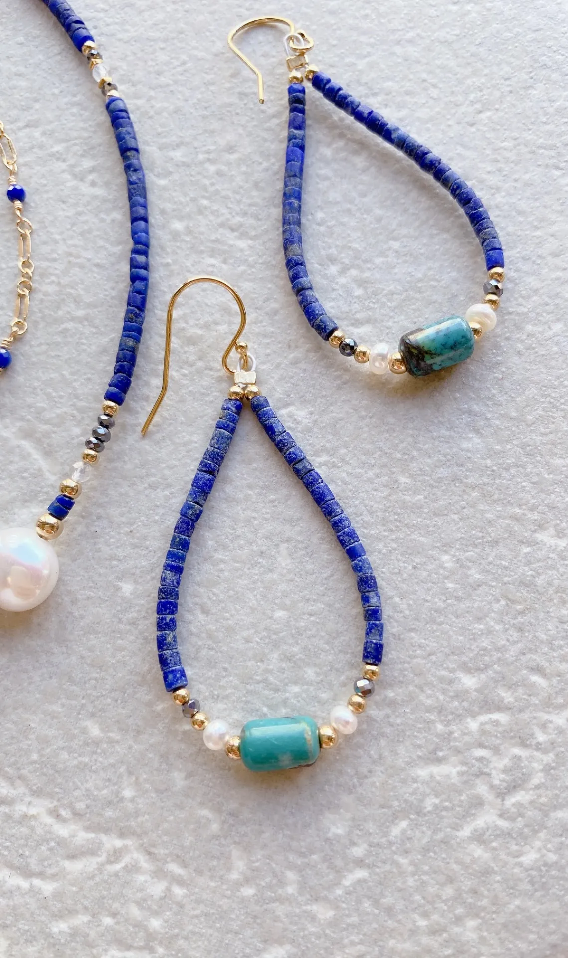 ピアスはラピスラズリの深いブルーに、爽やかな色合いの ターコイズ を合わせ、しずく型の軽やかに揺れるシルエットに💙