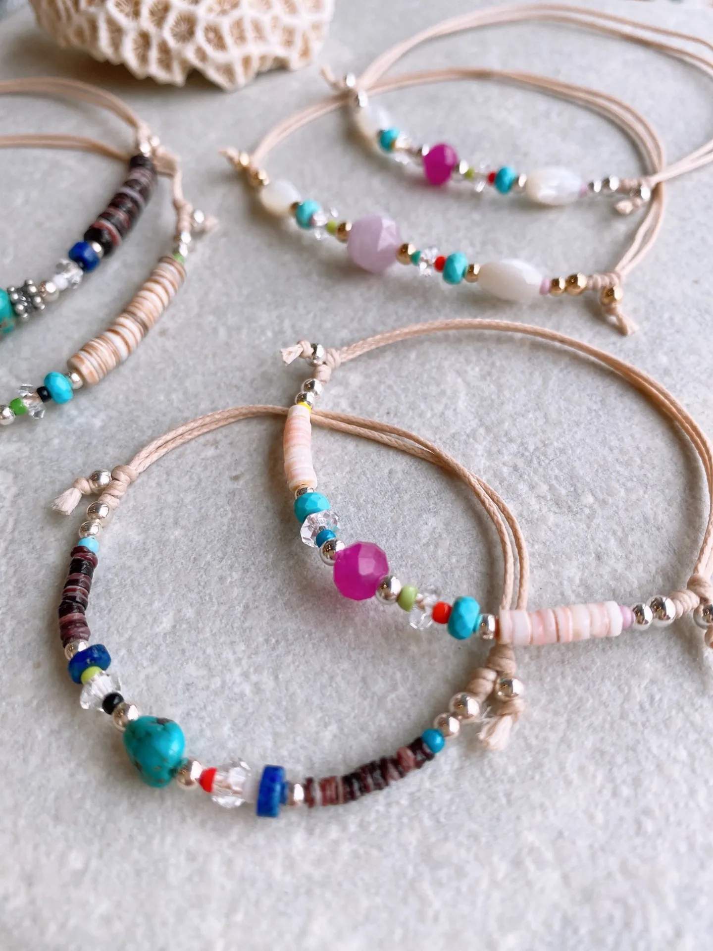 肌あたりのやさしいコットンコードに、天然石とシェルをちょこんとプラスして、