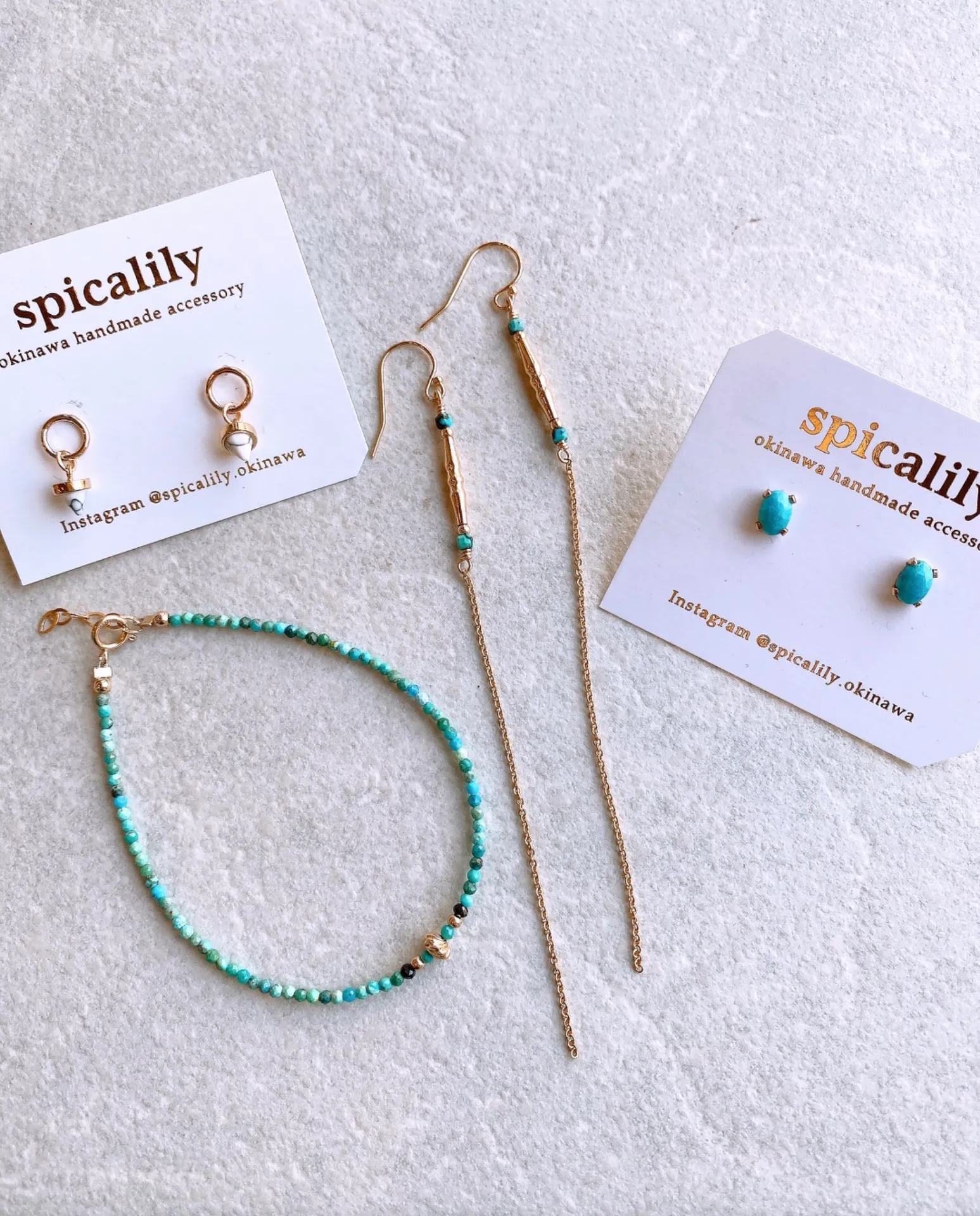 小さなサークルや三角のホワイトターコイズをあしらったポストピアスは、遊び心と上品さのバランスが絶妙🫶